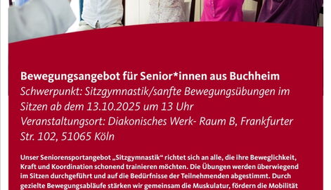 Unser Seniorensportangebot „Sitzgymnastik“ richtet sich an alle, die ihre Beweglichkeit, Kraft und Koordination schonend trainieren möchten. Die Übungen werden überwiegend im Sitzen durchgeführt und auf die Bedürfnisse der Teilnehm ...