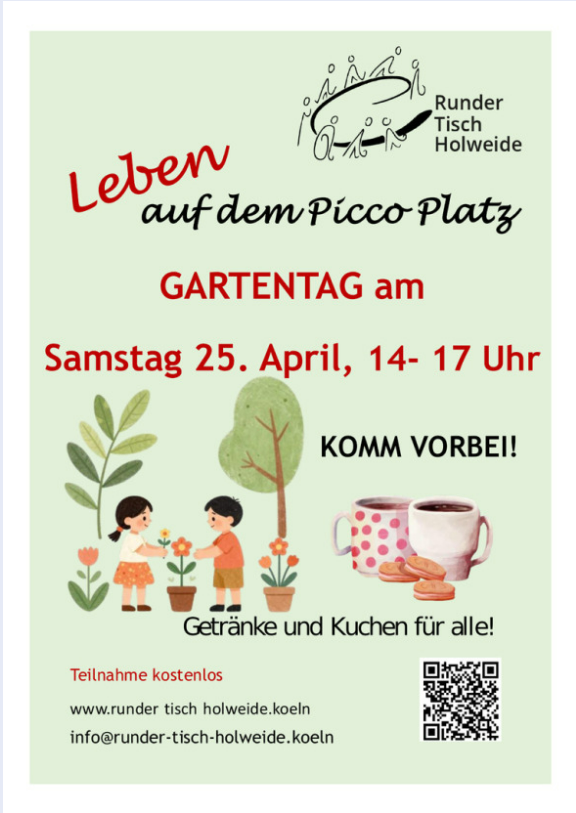 Der nächste Gartentag auf dem Picco-Platz steht vor der Tür! Kommt vorbei und macht mit, wenn gemeinsam mit anderen Bürger*innen der Garten verschönert und weiter wachsen wird.
